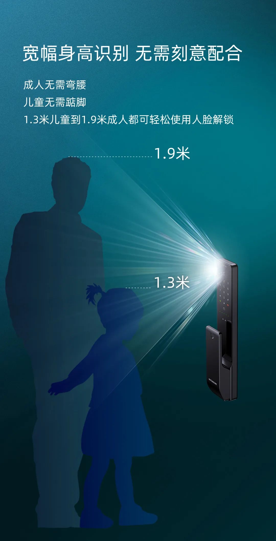 寬幅身高識別+自適應環境光線識別,無需刻意配合。V3f人臉安全云鎖使用超大視角,從1.3米兒童到1.9米成人都可輕松使用人臉解鎖,大人無需彎腰、小孩無需墊腳;采用紅外成像原理,搭配IR泛光燈補光,完成“自適應環境光線識別”的日常使用需求;哪怕環境是昏暗樓道,有紅外干擾,又或是有高強度陽光,人臉識別依舊高精度、高效、迅速。