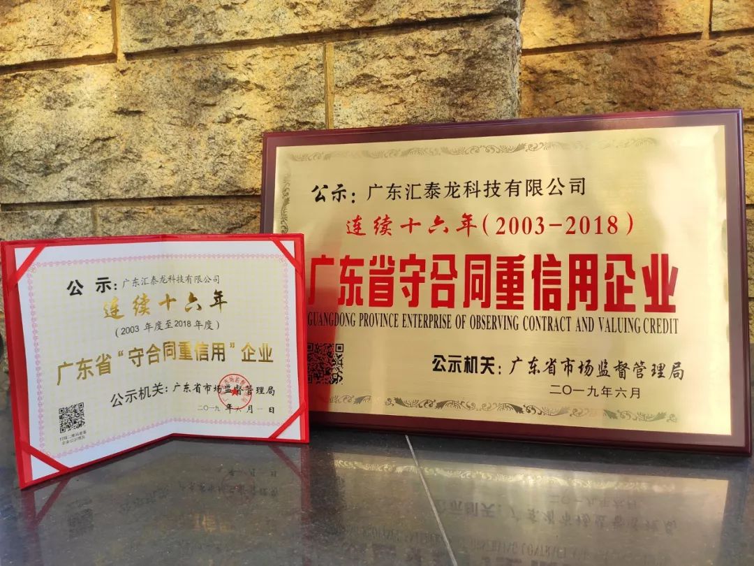 匯泰龍自2003年起,連續十六年獲“廣東省守合同重信用企業”稱號,既是對匯泰龍恪守誠信、規范經營的有力印證,也是對匯泰龍優秀品牌信譽建設成果的充分肯定。