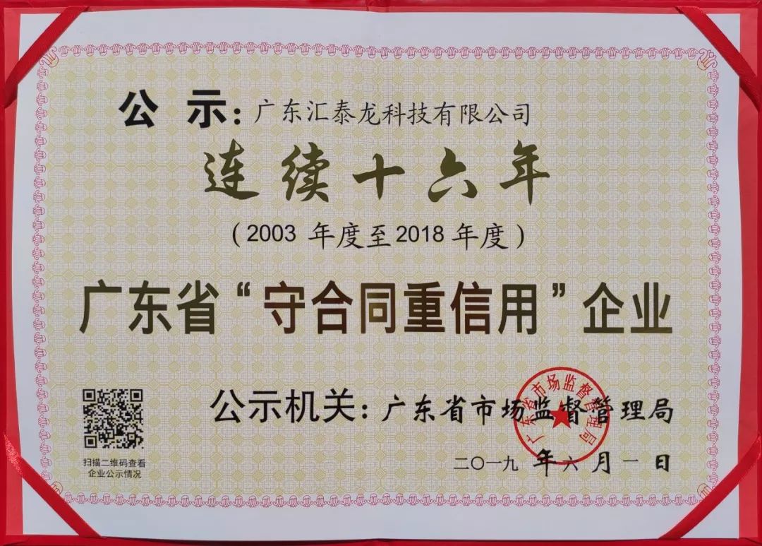 近日,經廣東省市場監督管理局嚴格審核并予公示,廣東匯泰龍科技有限公司(現已更名為“廣東匯泰龍科技股份有限公司”)被授予“連續十六年(2003-2018)廣東省守合同重信用企業”榮譽稱號。