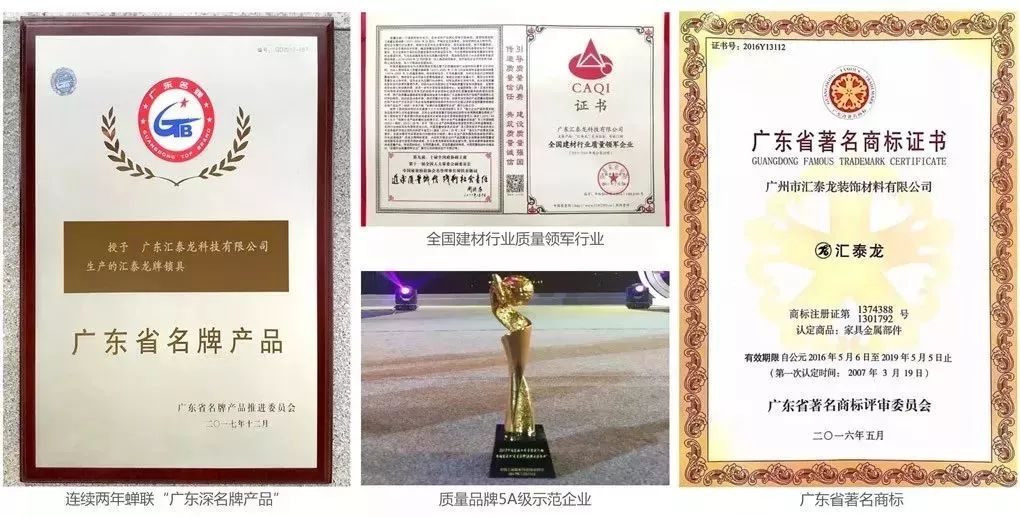 誠信經營,榮譽見證。23年來,匯泰龍因為守合同重信用,得到眾多權威機構的認可,榮獲“中國質量服務信譽AAA企業”、“全國建材行業質量領軍企業”、“全國家居業“質量品牌5A級示范企業”、“全國產品和服務質量誠信示范企業”等榮譽稱號。