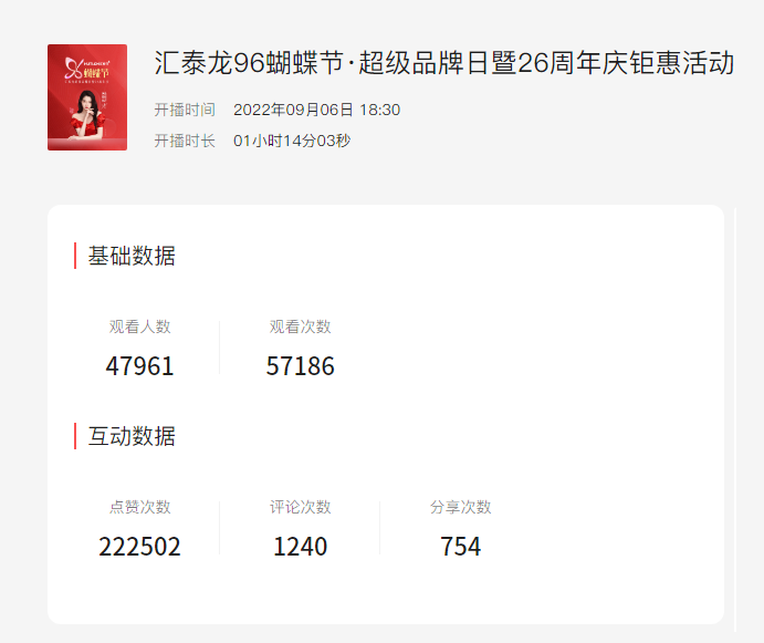 2022年9月6日晚,匯泰龍“96蝴蝶節·超級品牌日暨26周年慶鉅惠活動”通過線上發布會的形式呈現,新浪家居、智能門鎖研究Pro、門鎖世界、建博云網以及騰訊視頻號、新浪微博、抖音、天貓、京東等多平臺官方賬號同步直播。