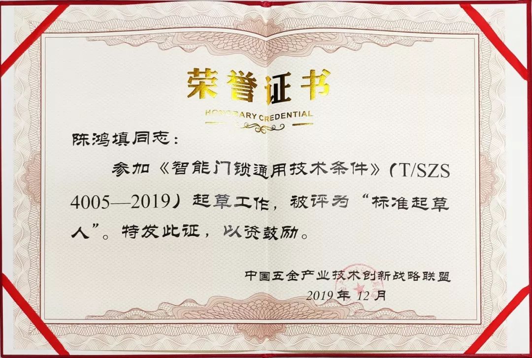 因匯泰龍是《電子防盜鎖》(GA 374-2019)、《智能門鎖通用技術(shù)條件》(T/SZS 4005-2019)兩大標準的起草單位,匯泰龍陳鴻填董事長參與兩大標準的起草,而在峰會上多次受到表彰,榮膺多項榮譽。
