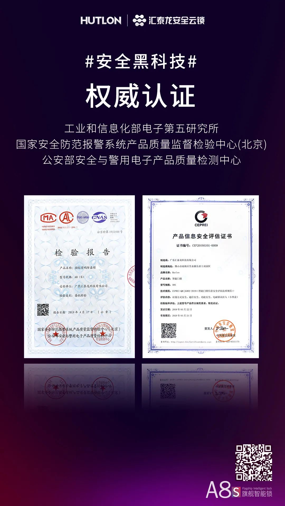 但!這還不夠!匯泰龍A8s智能鎖通過工業和信息化部電子第五研究所、國家安全防范報警系統產品質量監督檢驗中心(北京)、公安部安全與警用電子產品質量檢測中心的檢驗,質量無可挑剔!