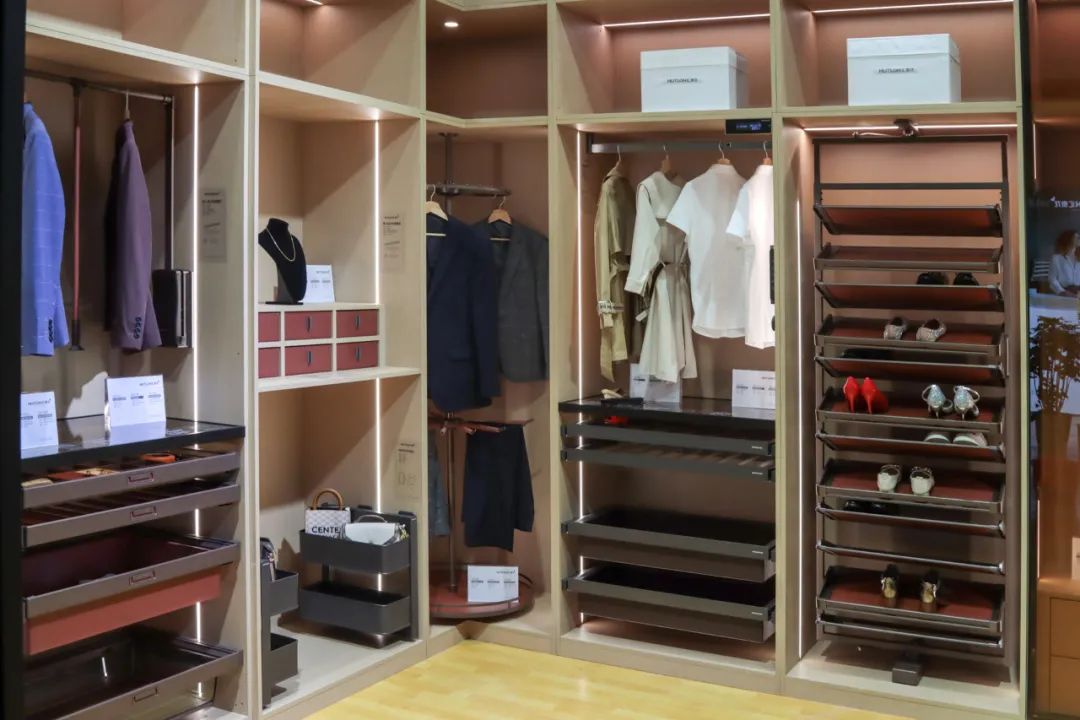 在衣帽間場景中,客商體驗到緩沖收納籃、緩沖飾品籃、緩沖褲架、頂裝掛衣架、升降掛衣架、轉(zhuǎn)角選擇衣物籃、旋轉(zhuǎn)鞋架等多種款式的衣柜收納五金,不僅收納能力強大,充分利用每一寸空間,還讓衣褲鞋襪、飾品在適合的地方展示出自己的魅力,方便用戶從容應(yīng)對各種工作、感情、聚會場景。