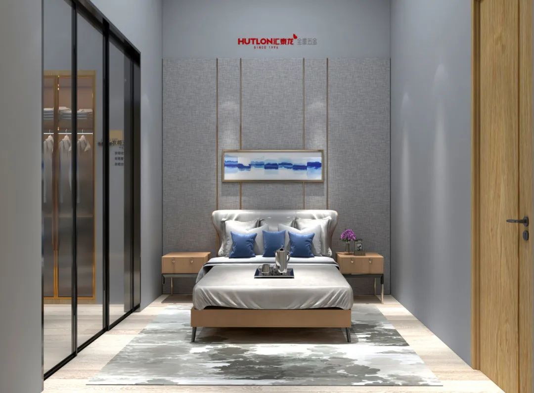 以“匯泰龍全屋五金定制+”為主題的匯泰龍展館,采用高端、極簡的中性灰為主色調(diào),改變產(chǎn)品直接陳列的展示模式,以匯泰龍全屋五金一站式解決方案為基準(zhǔn),將全屋五金產(chǎn)品融合到場景中,一比一還原家居場景,令五金的魅力看得見,摸得著,感受得到。