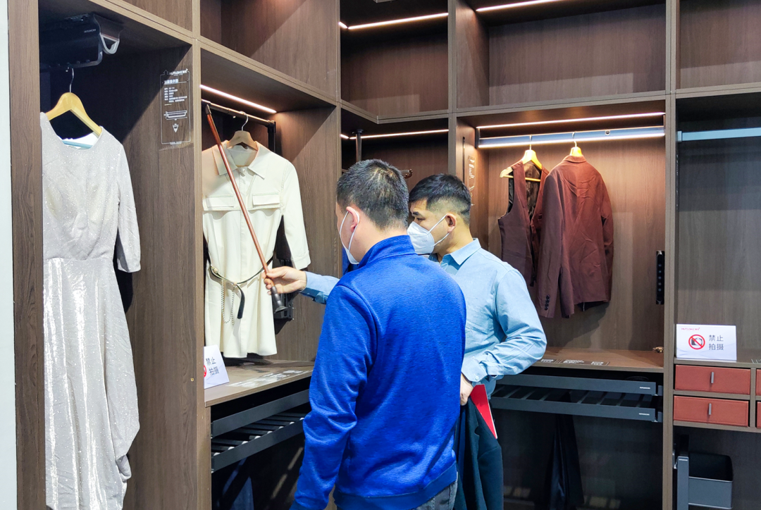 匯泰龍展館里,智能五金也融入到了廚房和衣帽間場景中。語音智能升降機,手指觸控/語音識別,吊柜平穩升降;智能百葉柜,手輕觸,百葉門扇向上打開,讓吊柜門開合更貼心;集紫外線殺菌、柔風加熱去潮、超聲波驅蟲等功能于一體的衣柜寶套裝,讓衣物更為整潔干凈;智能感應燈光,照亮櫥衣柜的每一處,讓每一樣物品都清晰可見……乘科技之風,讓生活更美好。