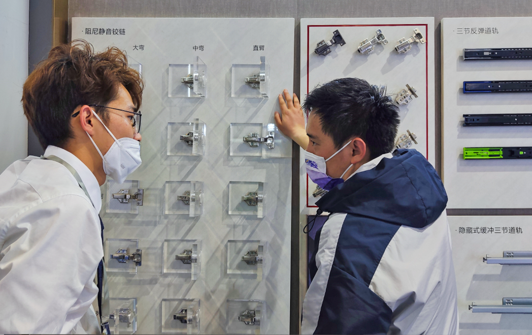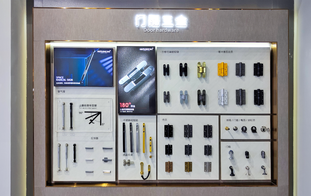 在家具五金展示專區,門配移門五金攜手登場。分為墻面展示區、鉸鏈功能體驗和抽屜體驗四個部分,充分展示了緩沖鉸鏈、三節緩沖自閉道軌、三維可調暗鉸鏈、緩沖液壓合頁、銅合頁、門吸、地吸、反彈器、暗插銷、防盜扣、吊輪等五金產品。