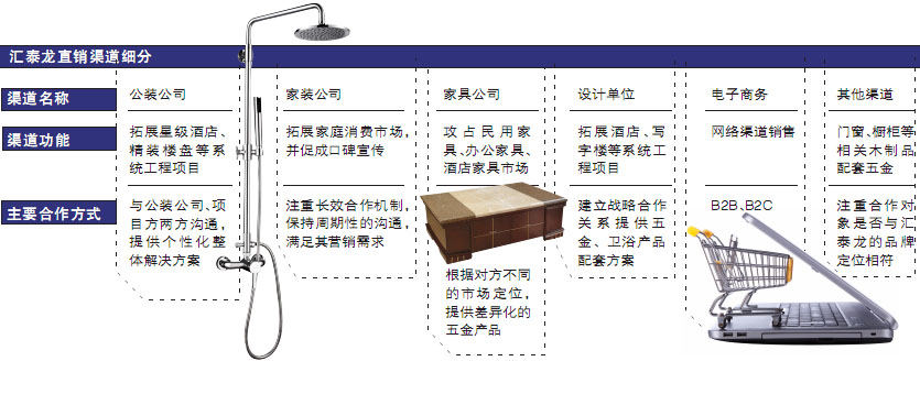 裝飾五金舊有的營銷渠道一般是比較簡單,建材市場(chǎng)、家具市場(chǎng)、五金店是傳統(tǒng)的銷售渠道。匯泰龍換了一個(gè)角度來思考,從產(chǎn)品的消費(fèi)對(duì)象出發(fā),進(jìn)行創(chuàng)新性的拓展并細(xì)分渠道。比如公裝公司、家裝公司、家具公司……都在匯泰龍細(xì)分的營銷渠道之列。除了產(chǎn)品的微創(chuàng)新,匯泰龍?jiān)谇赖募?xì)分上的微創(chuàng)新天賦也在彰顯。