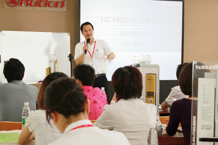 此次的培訓分為多個板塊,分別為:智能鎖市場分析;匯泰龍新產品介紹;操作使用;安裝與調試;售后服務。培訓采用幻燈片演示以及現場實操演練相結合,直觀地再現了匯泰龍智能電子門鎖內部結構和性能特點,從大家的自由的討論中總結匯泰龍新款智能電子鎖的優勢:360度指紋識別、啟動時間不到1秒、時尚的產品外觀設計、雙核雙電路設計等,在實操部分,大
