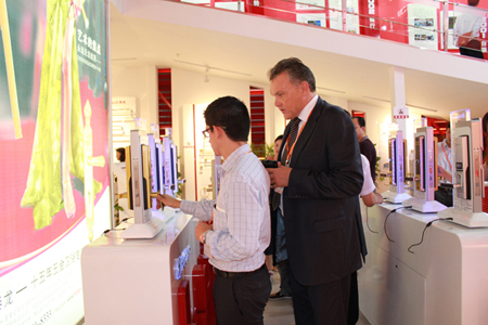 工作人員通過先進(jìn)的電子儀器為客商演示匯泰龍產(chǎn)品系列