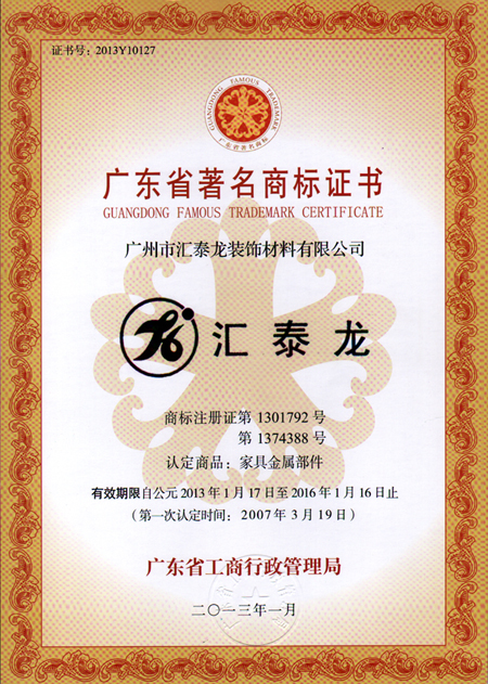 近日,廣州匯泰龍裝飾材料有限公司匯泰龍品牌通過廣東省著名商標(biāo)認(rèn)定委員會審核認(rèn)定,被延續(xù)授予“廣東省著名商標(biāo)”榮譽(yù)。這是自2007年3月頒發(fā)此榮譽(yù)后又一次的認(rèn)定。此稱號的獲取,是匯泰龍名牌戰(zhàn)略不斷推進(jìn)的結(jié)果,是公眾對“匯泰龍”品牌優(yōu)良品質(zhì)的認(rèn)可,它標(biāo)志著匯泰龍品牌建設(shè)又邁上了嶄新的臺階。
