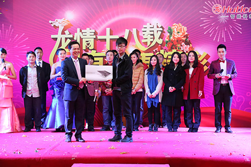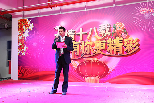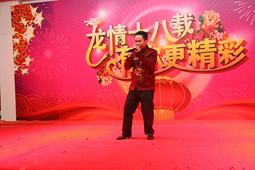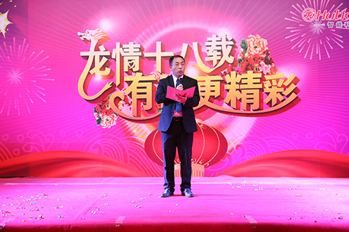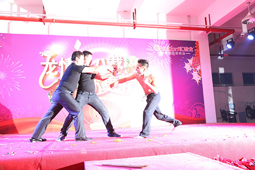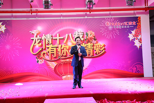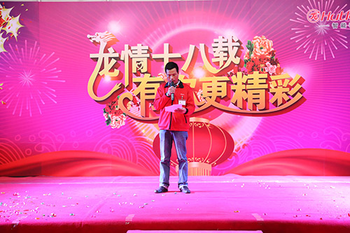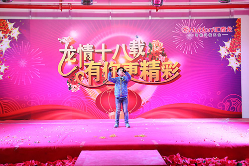 在四位主持人的引導下,陳董上臺發(fā)表新年賀辭,他首先向大家總結了我們在2014年取得的成績,對一年來全體匯泰龍人的付出和努力表示感謝,同時,他指出2014年受房地產行業(yè)的影響,整個家居建材行業(yè)都很嚴峻,我們匯泰龍公司全體同仁齊心協(xié)心仍然取得了一定的成績。面對2015年,我們通過轉型、一系列變革等措施,一定會繼續(xù)發(fā)力,再創(chuàng)匯泰龍的輝煌。最后,他熱情洋溢地表達了對在場所有員工和員工家人新年的祝福,在場的員工深受鼓舞,報以雷鳴般的掌聲。