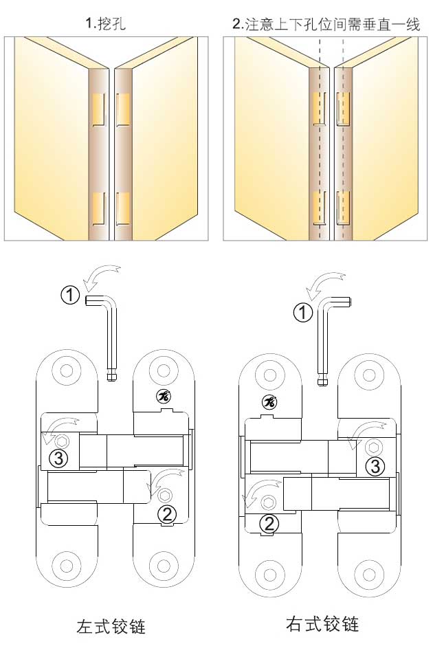5.裝好后分別調節螺絲①②③使門在正確的位置;